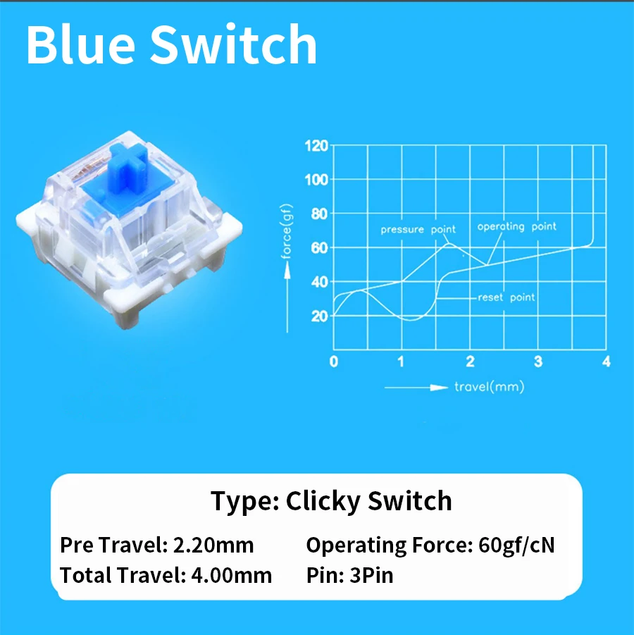 Descriptions: The trigger is faster than the Outemu Blue Switch, the sound is crisp, trigger faster,and there is a clear sense of passage, it is the improvement version of the Outemu Blue Switch.