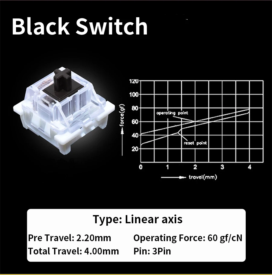 Descriptions: The linear switching characteristic combined with an increased spring force triggers directly. Thanks to a stronger spiral spring, the tried and true Outemu Black Switch smoothly moves the keys back to the starting position and grants the necessary staying power for long writing and gaming sessions.