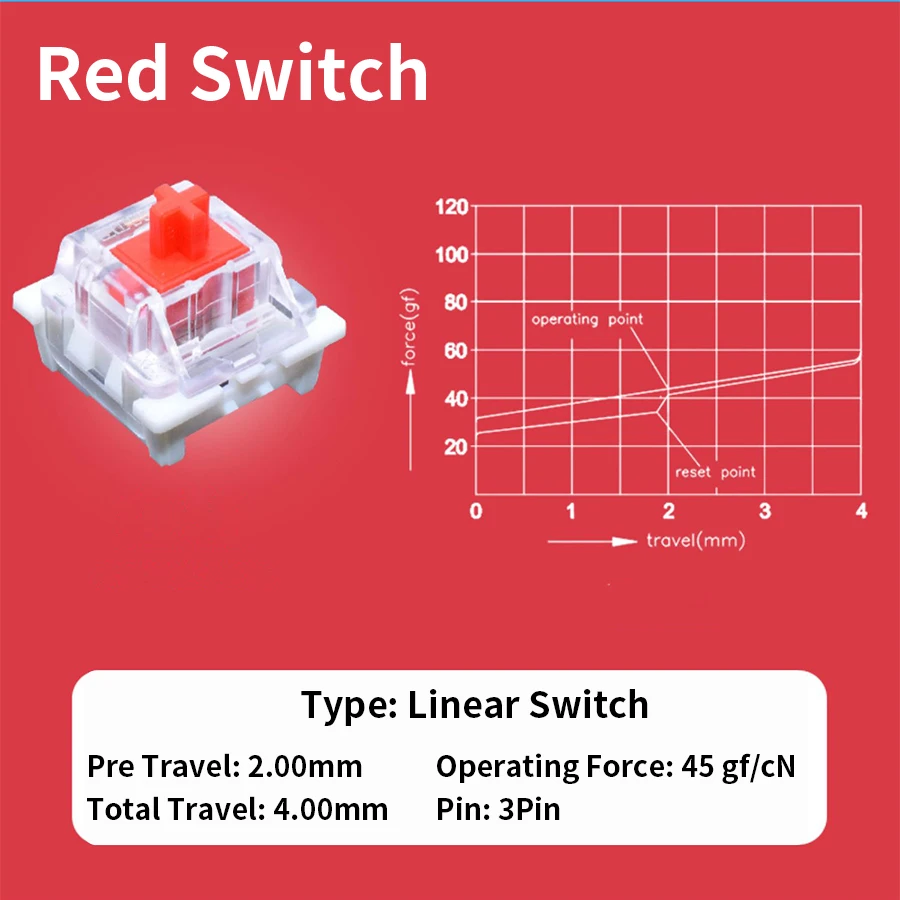 Descriptions: The linear switching characteristic combined with the low spring resistance triggers directly. The Outemu Red Switch is the first choice for beginners in the world of mechanical keyboards.The smooth-running enables balanced writing and gaming sessions.